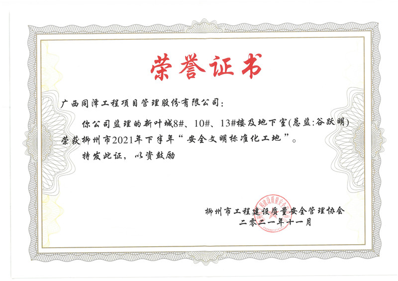 柳州新葉城項目8#、10#、13#樓及地下室項目榮獲柳州市2021年下半年安全文明標準化工地
